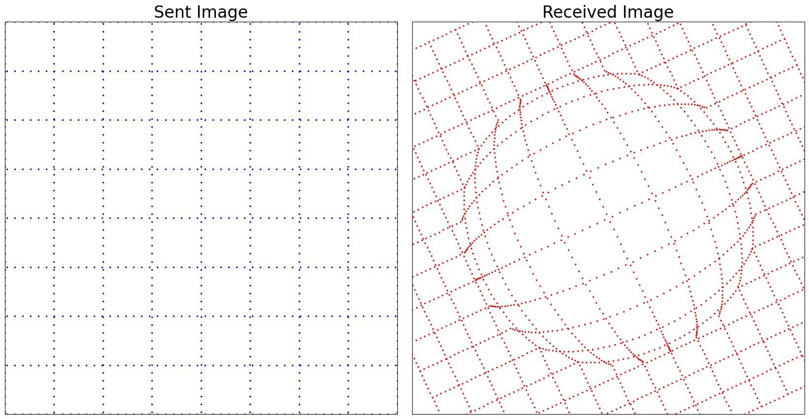 Immediately, one can notice a few problems: the sender and receiver do not synchronize the zoom and the orientation of the coordinate system. In addition, let’s imagine a nonlinear distortion that might happen in the channel in the form of a lens with its center in the origin. The receiver, looking at the point cloud, has no way to notice that data has undergone a distortion. See Figure 2 where a hypothetical received image is shown. Has rotation, scaling or lens distortion occurred during transmission? There are no clues to answer this question. Typically, a sender will run compression and/or optimal encoding schemes to remove all irregularities in its data to maximize channel capacity utilization. This means that the point clouds that are sent are made as uniform as possible. This makes it even harder for the receiver to have any clues about transformations that happened in the channel. This is a scenario specifically chosen to demonstrate the impossibility of transmitting raw data, with no meaning, no structure in it.