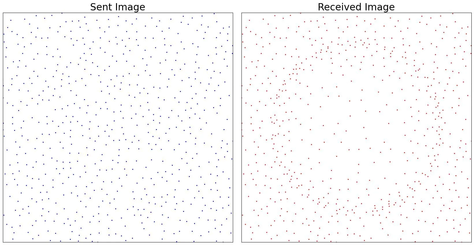 Imagine a communication scenario in which a sender needs to send a certain amount of bytes to a receiver. For simplicity, we ignore the ordering of bytes and consider them a set. The communication channel is chosen in the form of an image. We assume for simplicity that the coordinate system origin is fixed in the center, axes are orthogonal and this is always known to the sender and the receiver. The sender converts each byte into coordinates of a point on this image using a fixed procedure. Thus, a set of bytes gets represented as a 2D point cloud on an image. The receiver then looks at the obtained image, measures coordinates of the points, runs the inverse conversion procedure and obtains the original bytes. See Figure 1.