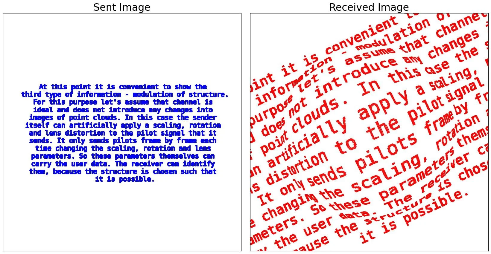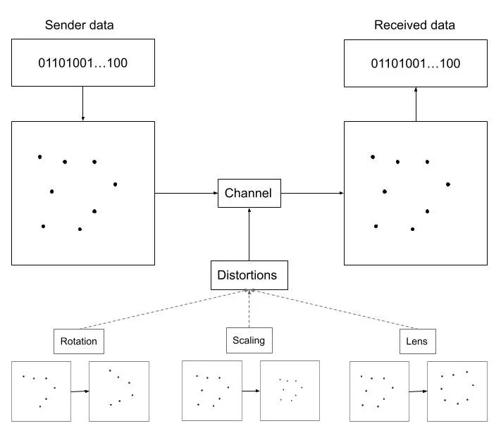 At this point it is convenient to showcase the third type of information - modulation of structure. For this purpose let’s assume that the channel is ideal and does not introduce any changes to images of point clouds. In this case the sender itself can artificially apply a scaling, rotation and lens distortion to the pilot signal that it sends. It only sends pilots frame by frame each time changing the scaling, rotation and lens parameters. So these parameters themselves can carry the user data. The receiver can identify them, because the structure is chosen such that this is possible.